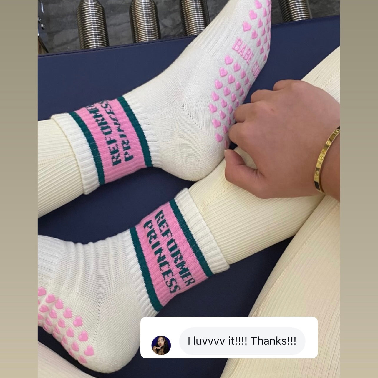 With dreamy pastel accents, heart-shaped grips, and that bold “Reformer Princess” print, this pair is your studio crown 👑